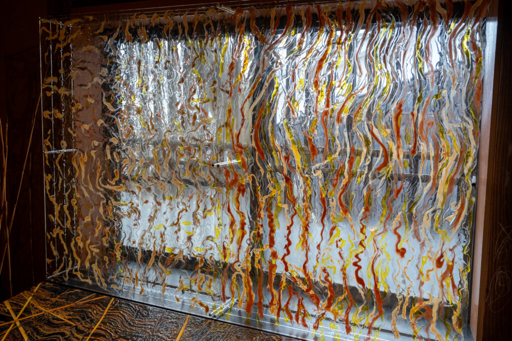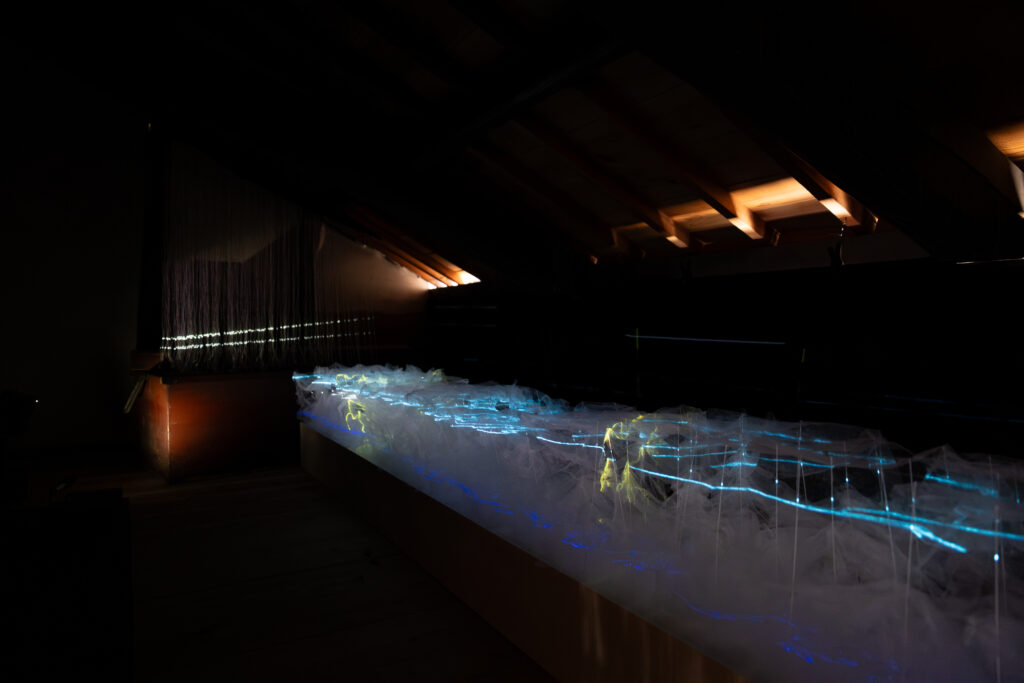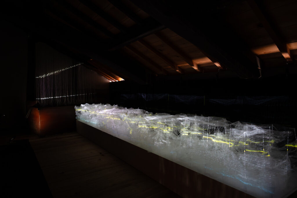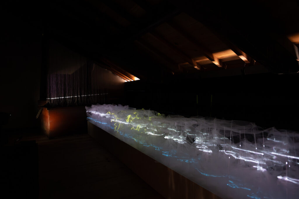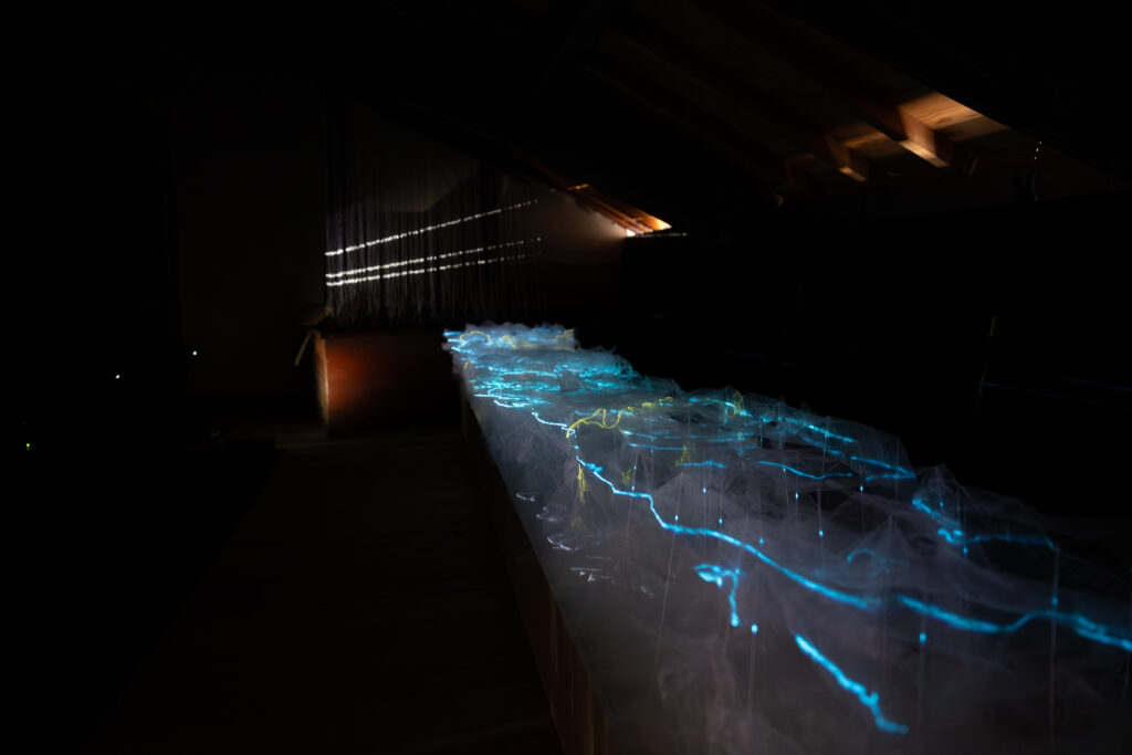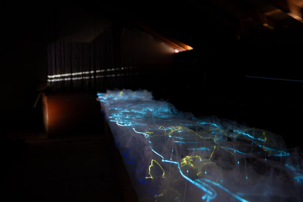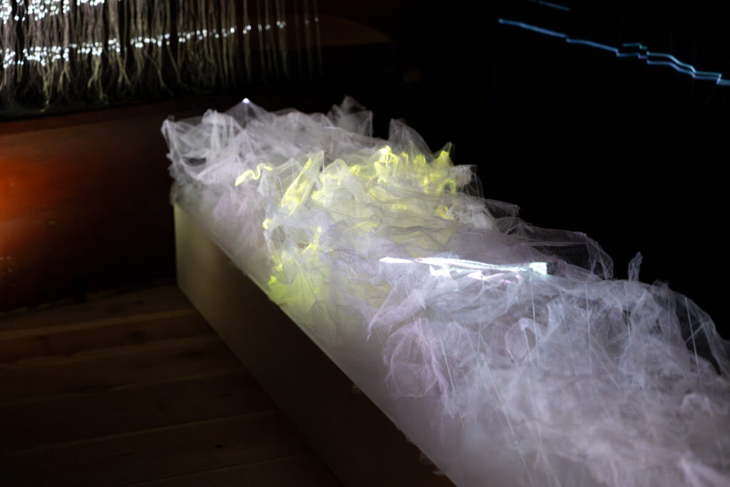 霧のような白い物体の中を電気のような光が流れていきます。霧のようなものは何なのかと思っていましたが、丸めてから広げた薄い紙を重ねたものだそうです。紙のしわに沿って光が流れていたということですね。色々な色が流れる様子はとても綺麗でした!