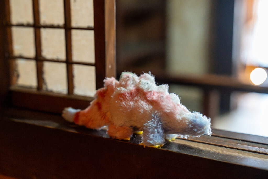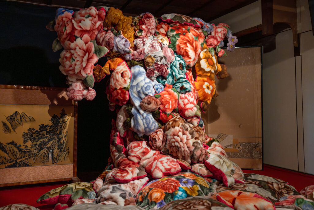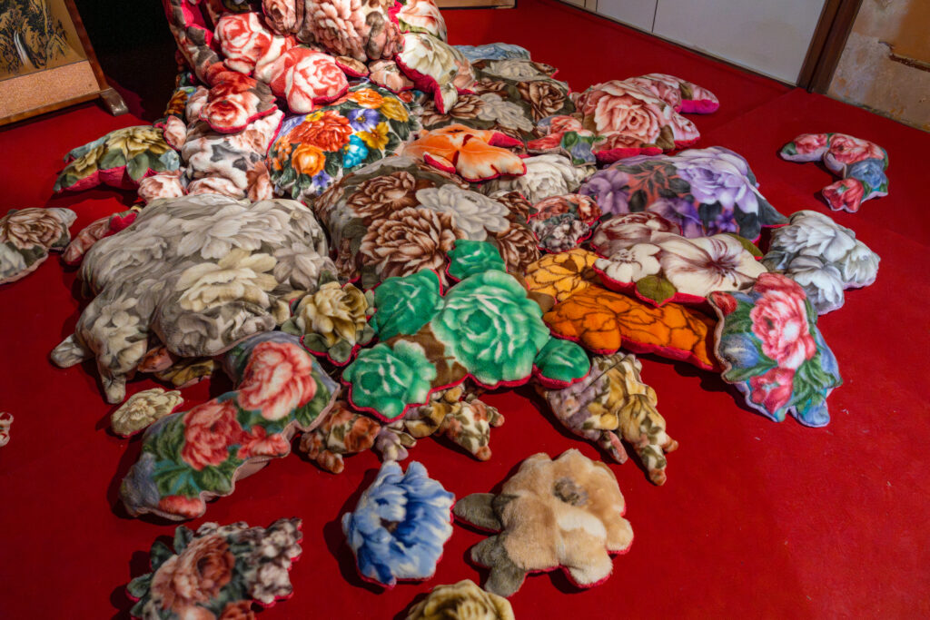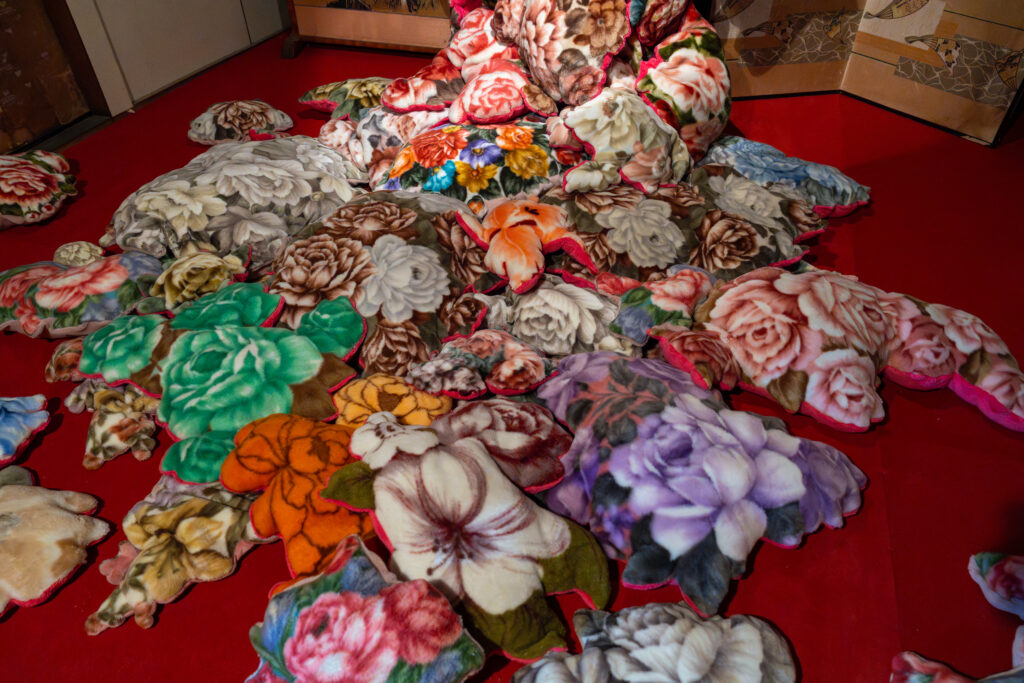 花柄の毛布から花柄の部分を切り取って着物が作られていました。花柄の毛布は柔らかくてどこか懐かしい、優しいものですが、これだけ集まるとすごい迫力です。作品説明に「その花柄だけを切り取って着物にしたら、まるで動物の毛皮のように、無慈悲に一部だけを切り取られたコートのよう。」とありました。元が動物ではない花柄毛布は切り取れるけど、動物の毛皮を切り取るのは抵抗がある人もいるかもしれない。じゃあ植物由来のものは切り取れるのか?切り取れる境界はどこか?といったことを考えるきっかけを投げかけてくれているのかもしれません。(私の勝手な解釈です)