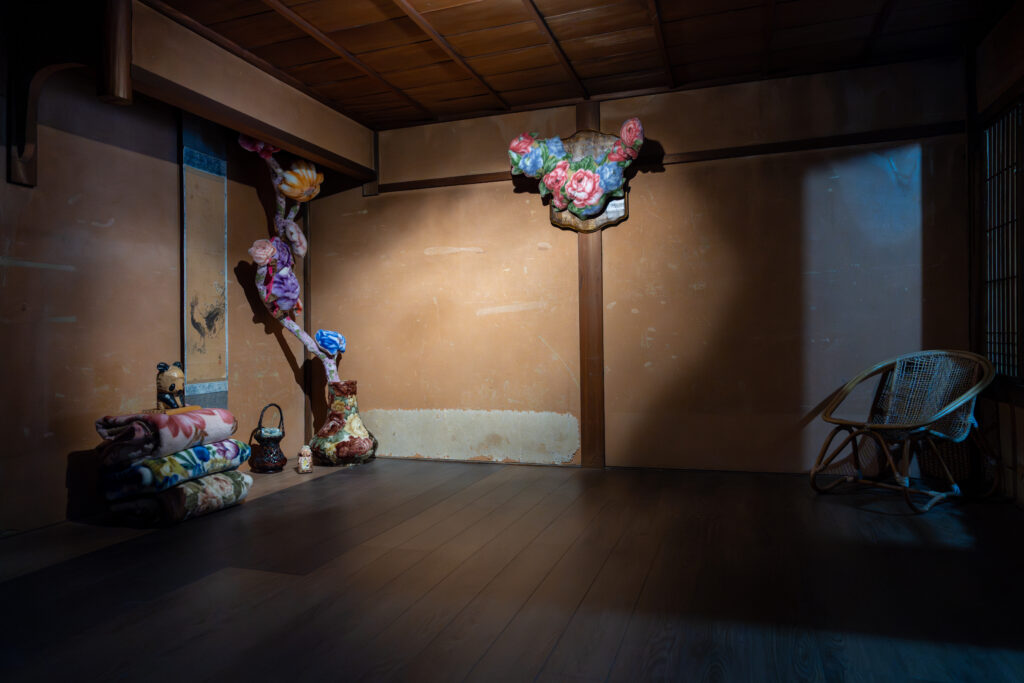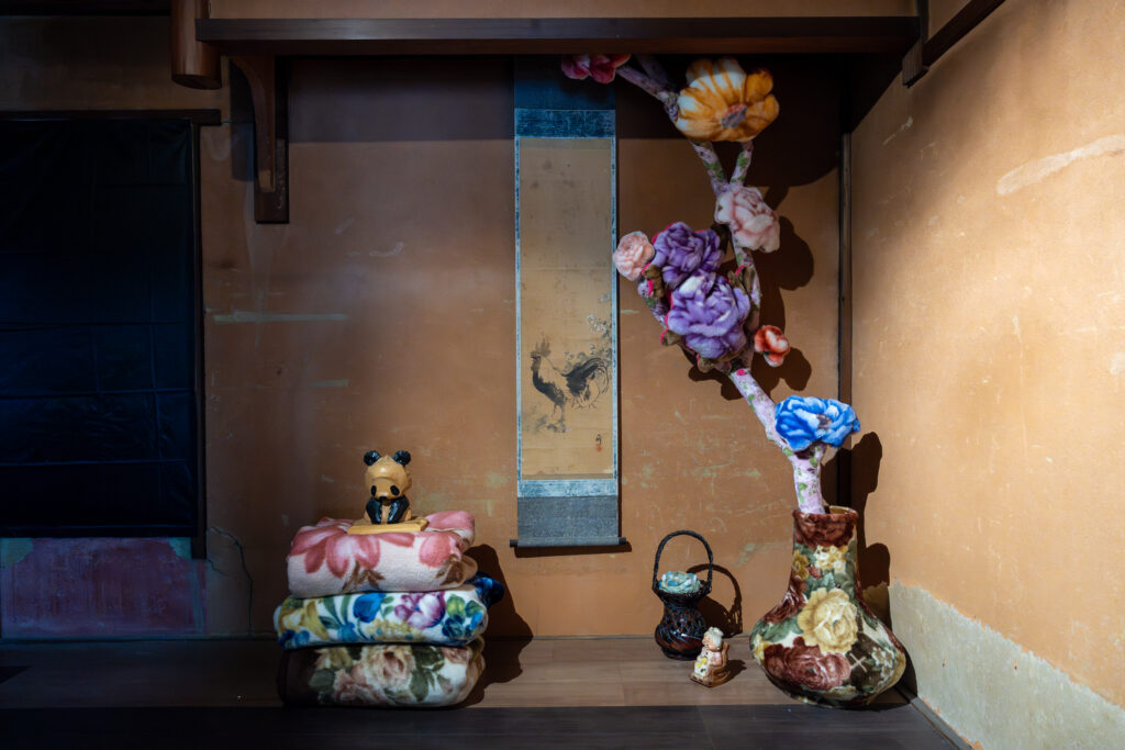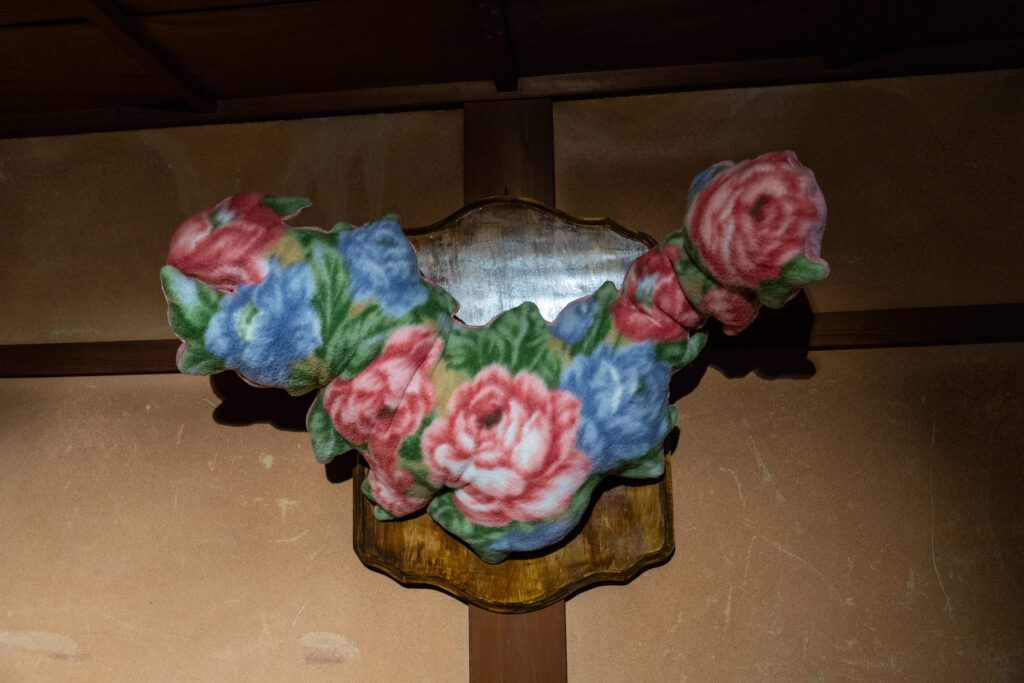 毛布製薔薇柄袷着物の前の部屋には、花柄で作られたオブジェや小物が置いていて、気持ちを盛り上げてくれます。