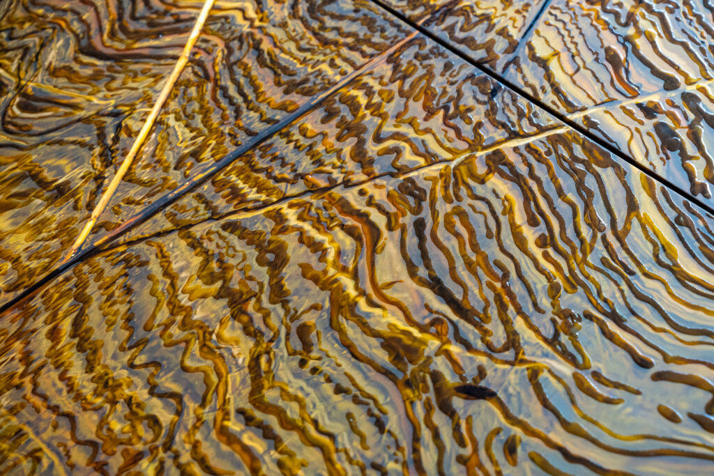 近江八幡のヨシ原をテーマに部屋が作られています。ヨシが生えている様子や、ヨシが水面に映った様子で、部屋の中に庭があるみたいになっています。まるで高級旅館みたいな雰囲気。
