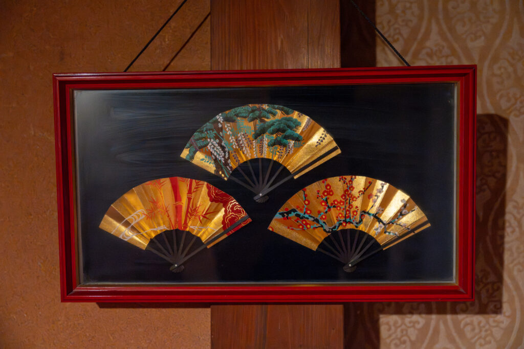 こちらは壁に飾られていた扇子。扇子も煌びやか。