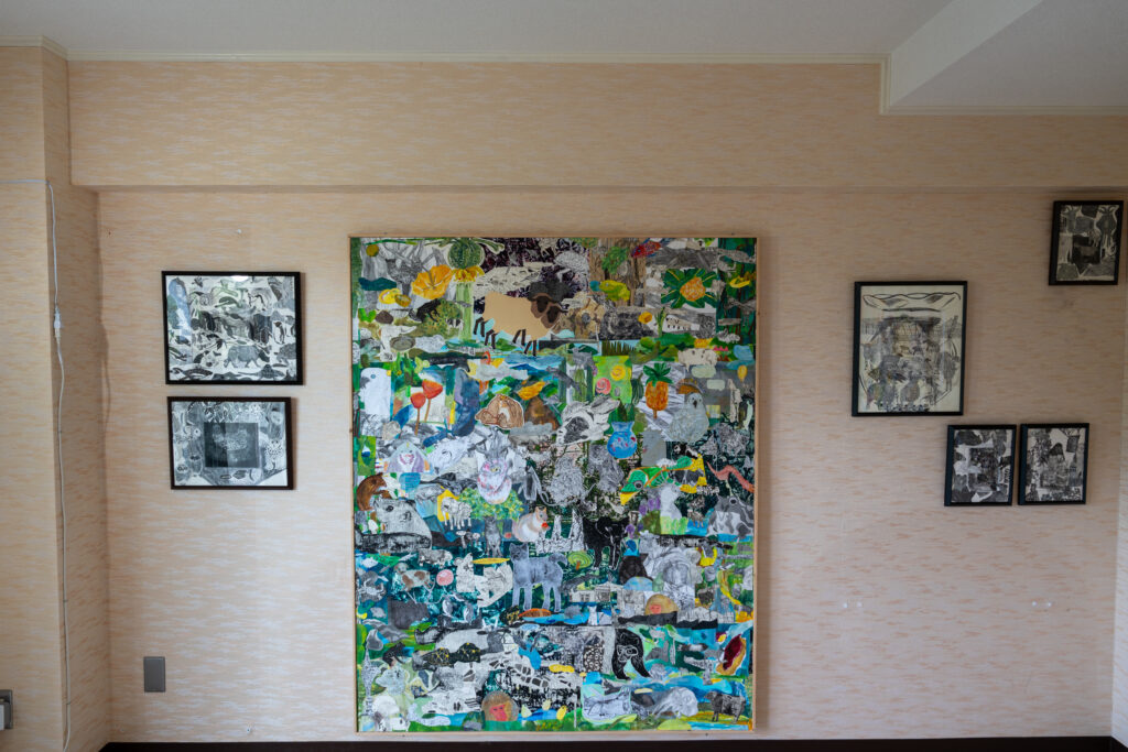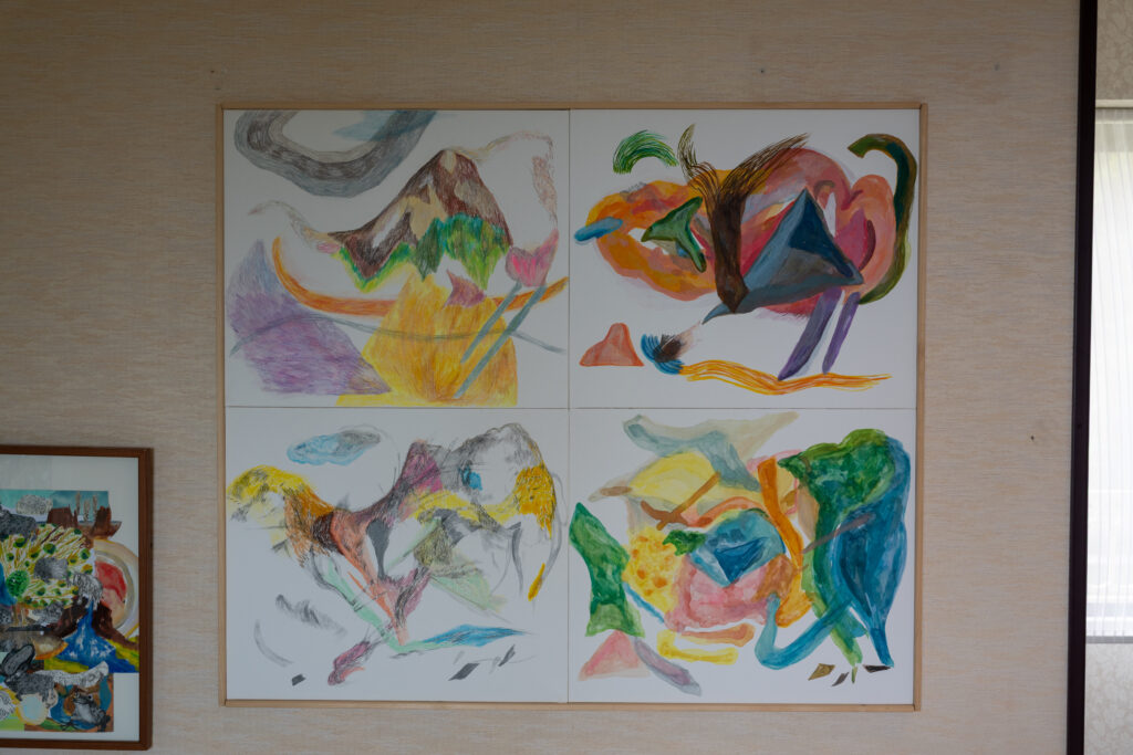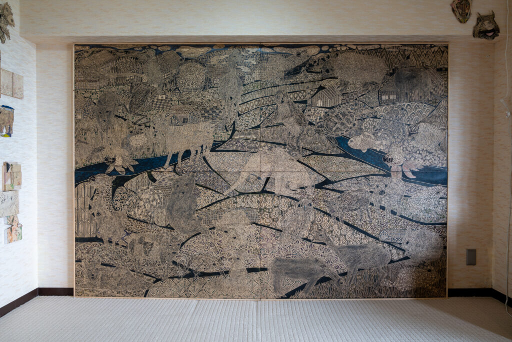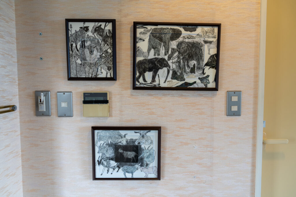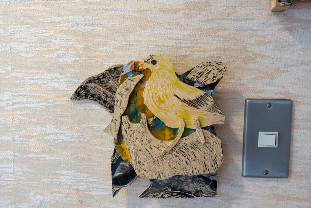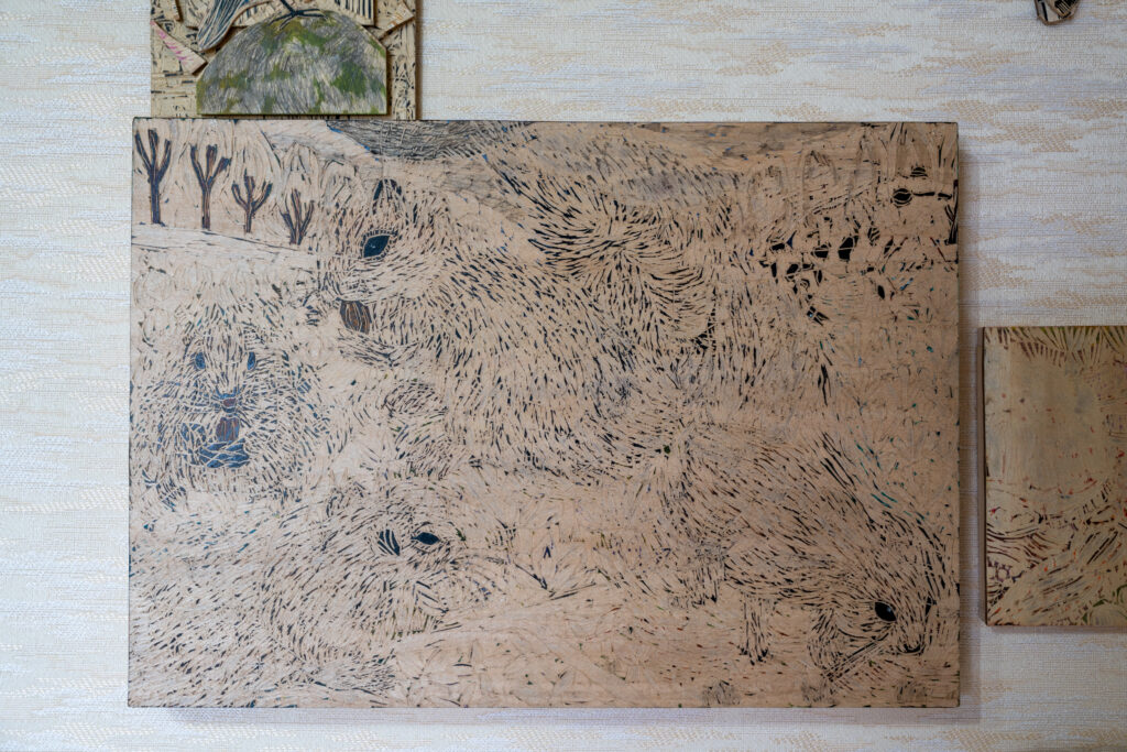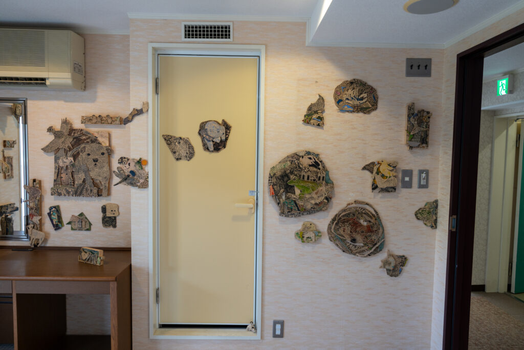 板に彫刻刀で線を描き彩色された作品です。壁一面の大きさから、小さなものまで様々で、可愛らしい動物たちが描かれています。板とは思えない丸っこい動物たちが良いな~と思いながら鑑賞しました。