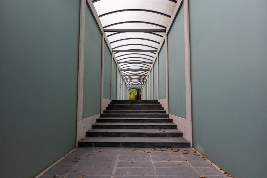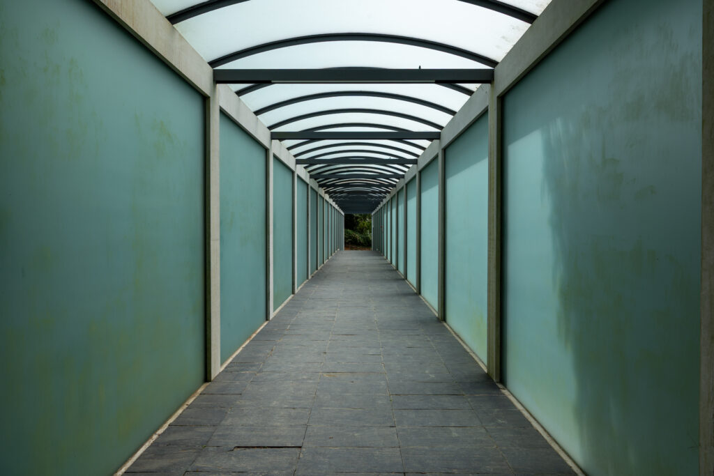 グリーンのガラスが日光を通してキレイな通路。