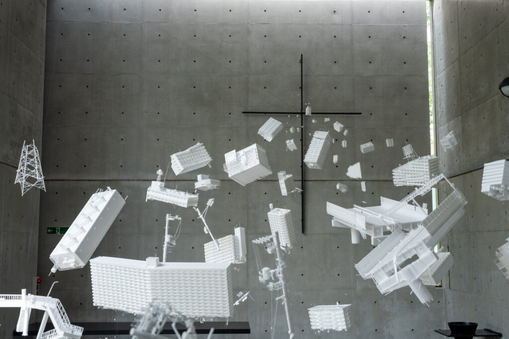 風の教会の内部には無数の壊れた建物が浮かんでいました。十字架から壊れた建物が広がる姿はどの角度から見ても美しく感じますね。奥の建物が小さくなっているので、実際よりも奥行きを感じるところも面白いです。