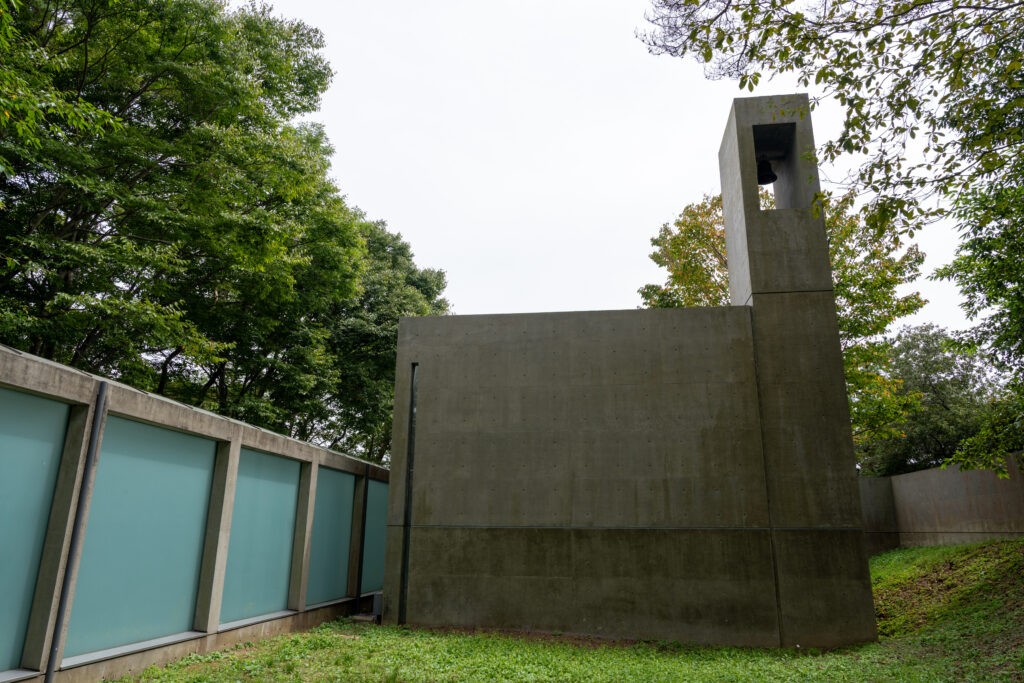 風の教会は安藤忠雄氏が設計した教会です。コンクリート打ちっぱなしの建物や、グリーンのガラスで囲まれた通路が美しくてたまりません。また、ほっそい十字架もスタイリッシュでステキです。