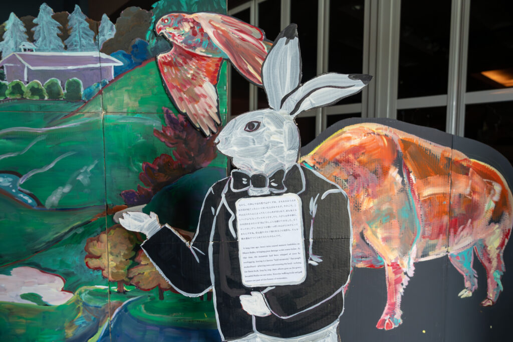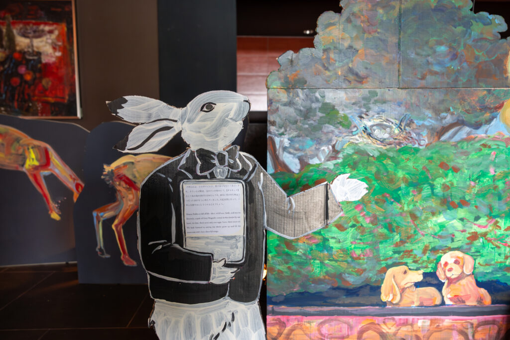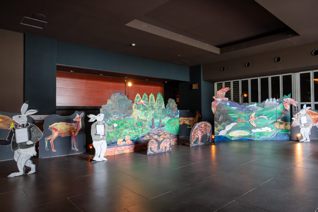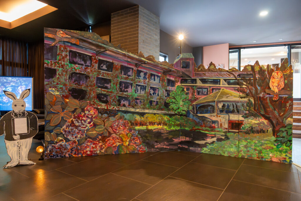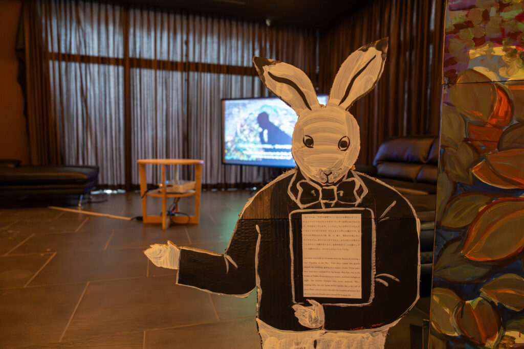 このホテル(天空の楽園)はかつて人間のオーナーによって管理されていたそうです。ある日ホテルにウサギがやってきてオーナーと過ごすようになります。人間のオーナーがいなくなった今、ウサギがホテルを管理しているとのこと。というわけで、ウサギのコンシェルジュが出迎えてくれるわけです。ホテルの営業が終了した旧六甲スカイヴィラ、人の気配を感じない雰囲気がこの作品を際立たせているようでした。また、人間の時代が終わって動物の世界が来たような、そんな気分にもなれます。