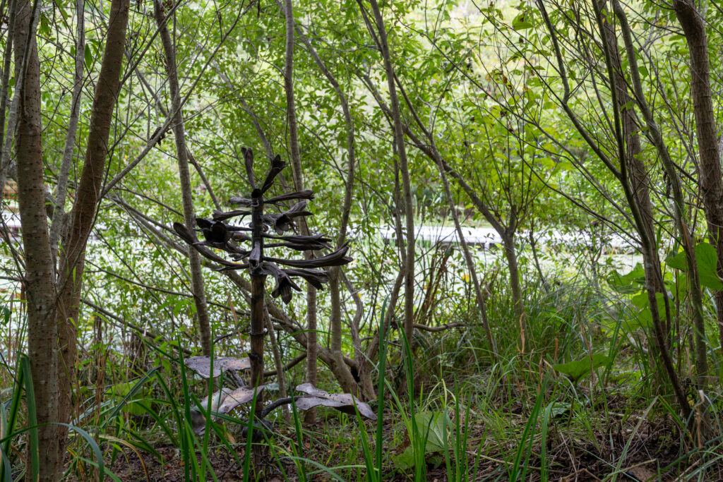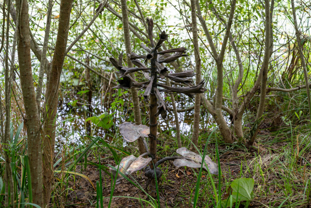 オオウバユリはユリ科の多年草で、1度だけ花を咲かせる植物です。そんなオオウバユリが鋳造で作られています。このオオウバユリは花が咲いているので、これから枯れていくのだと思われます。また、生えている場所が気に囲まれて目立たないのですよね。なんだか人知れず頑張って輝いているようで、少し切ない気持ちになります。
