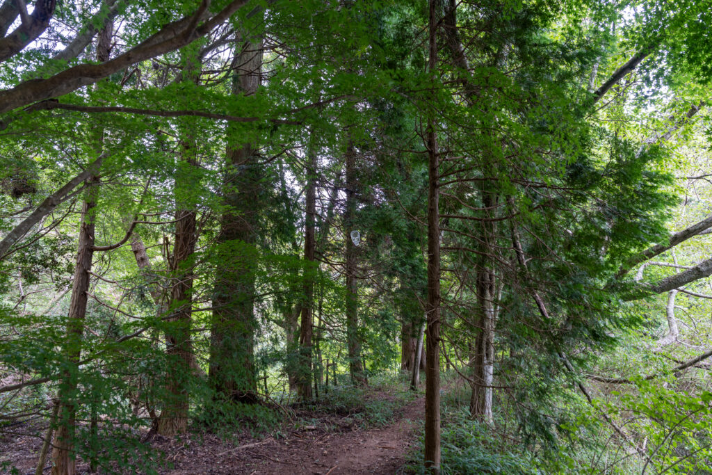 翁のお面を通り過ぎて、立ち入り禁止の看板から見えるお面。。遠くて見つけにくい!