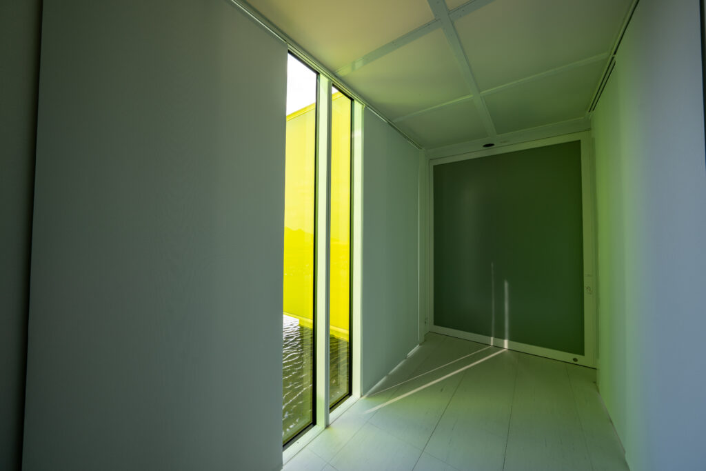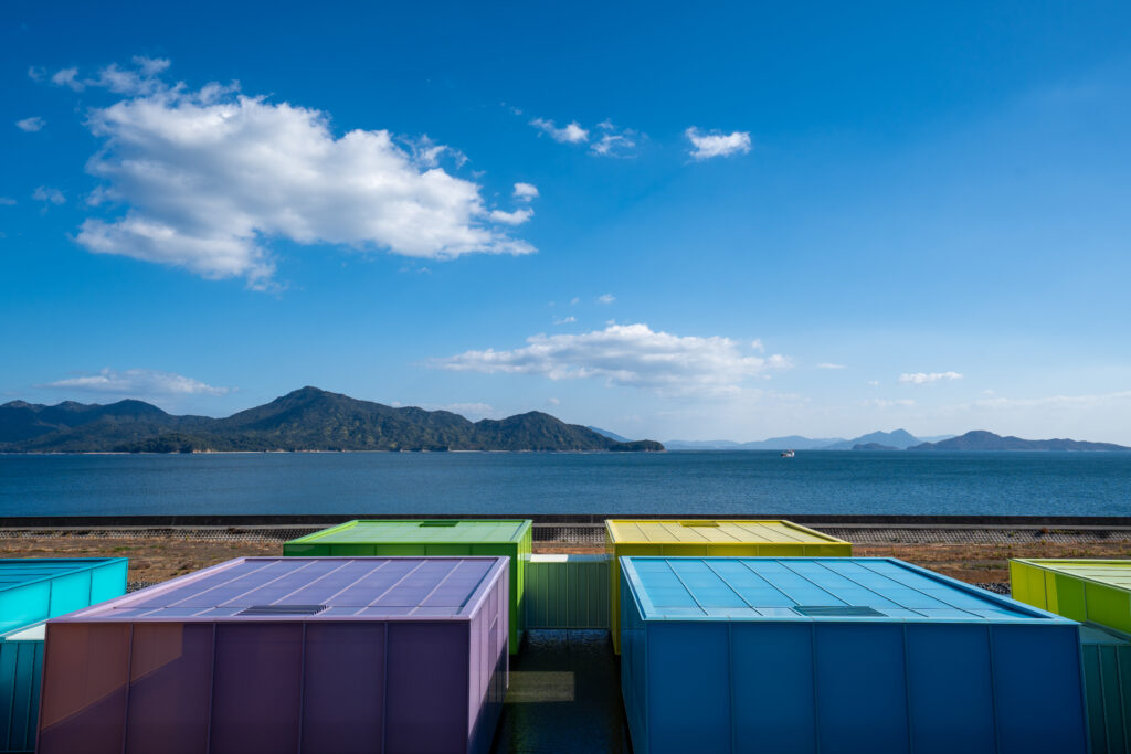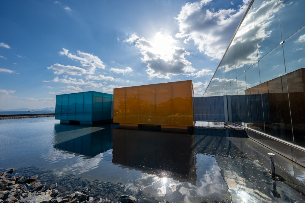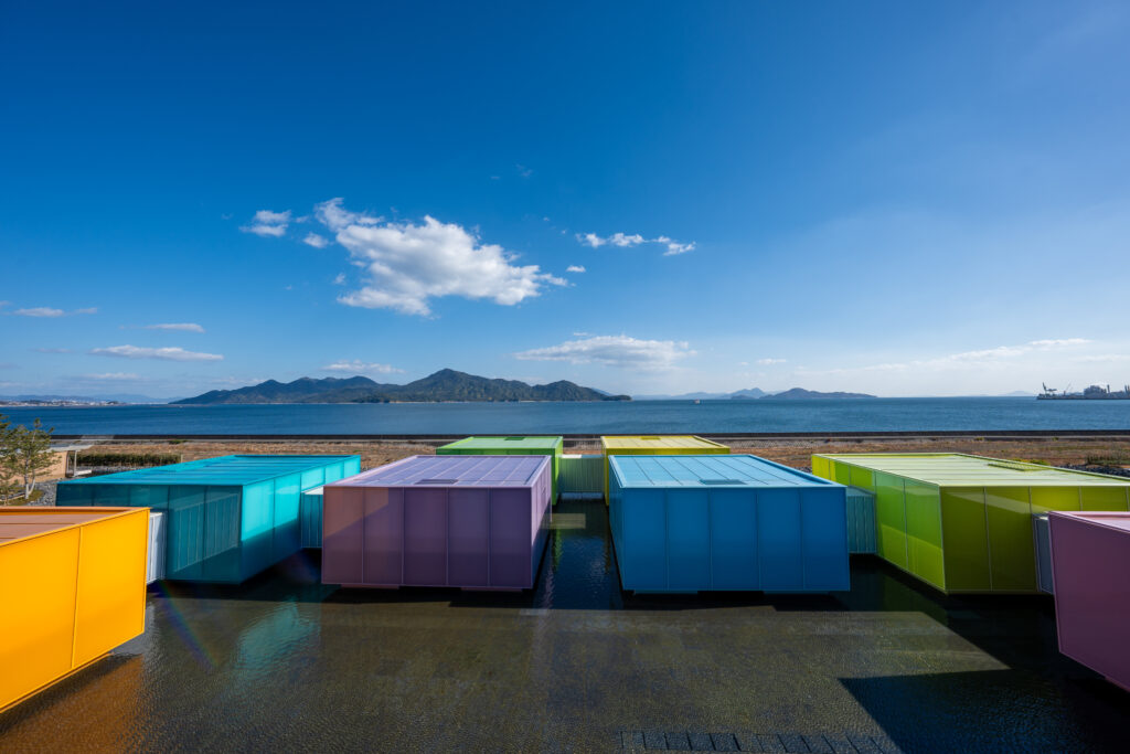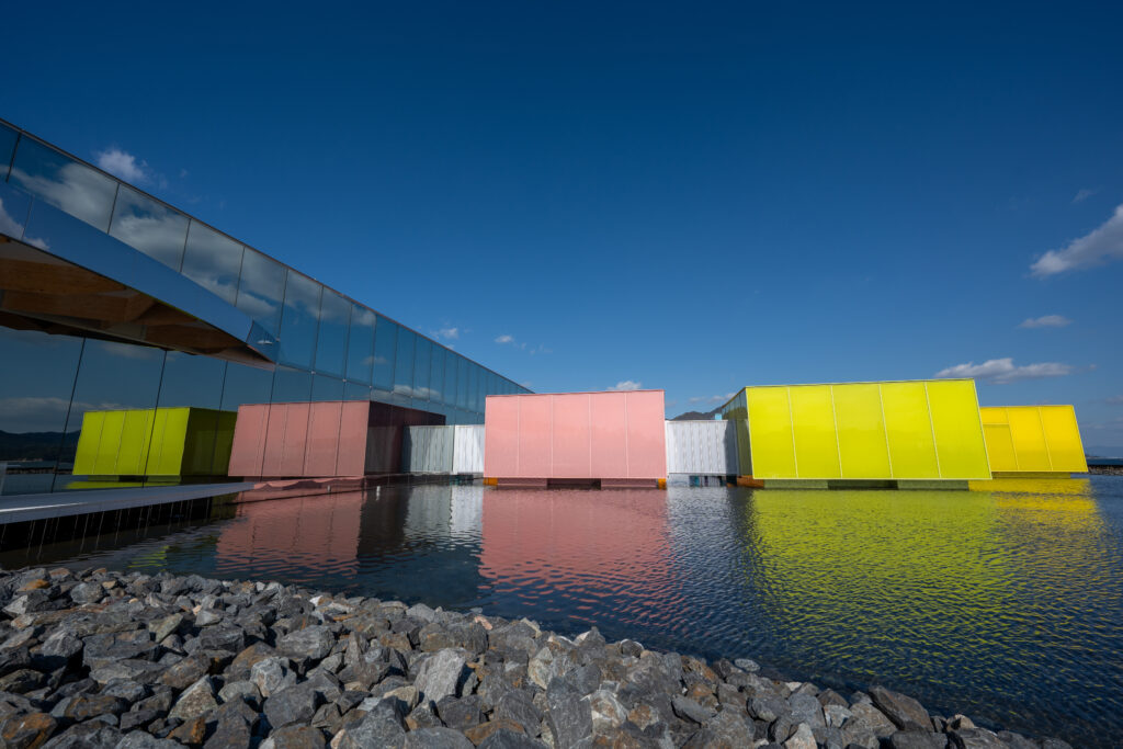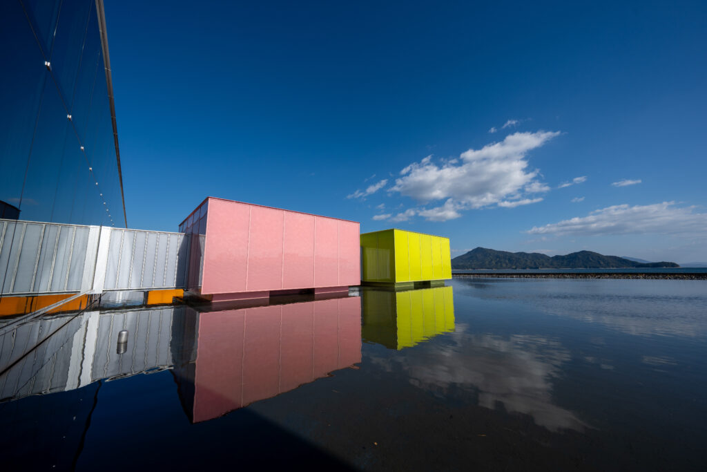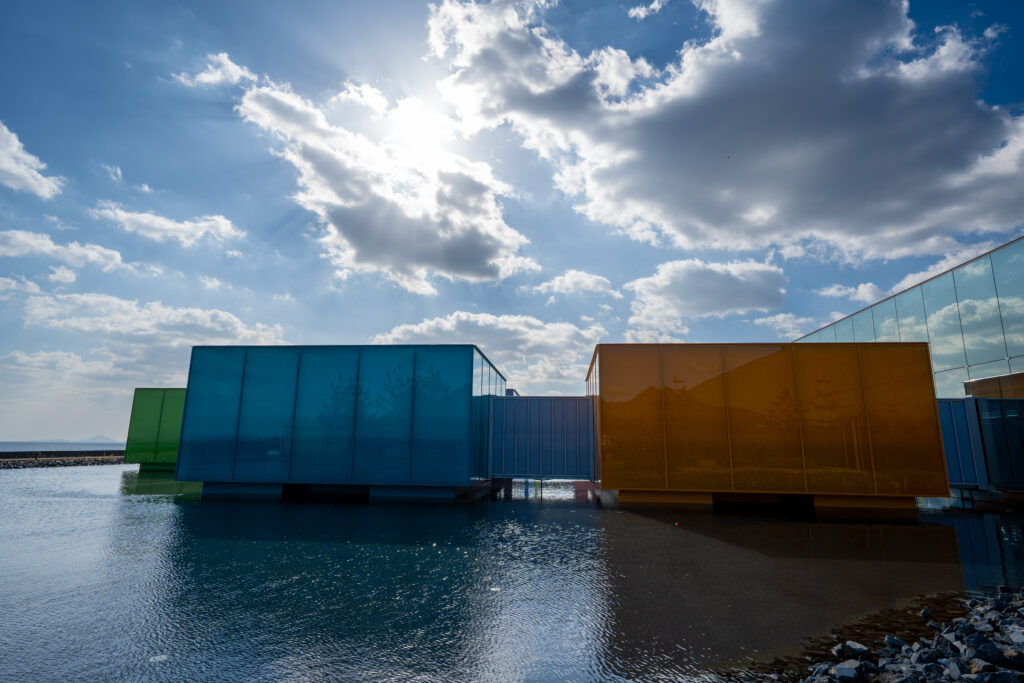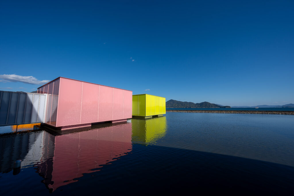 可動展示室は下瀬美術館の一番の特徴といっても良いではないでしょうか。水に浮かんだ鮮やかなコンテナは美しくて見とれてしまいました。その名の通り中は展示室になっていて、歩き回ることができます。