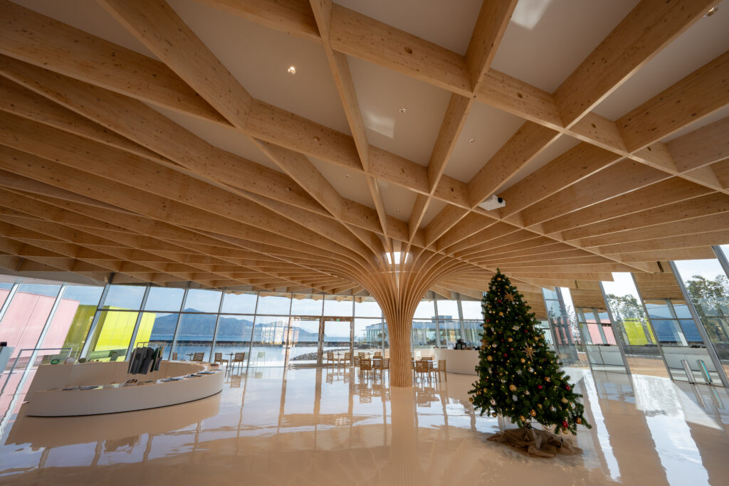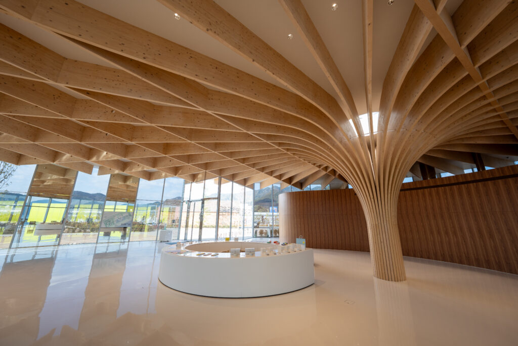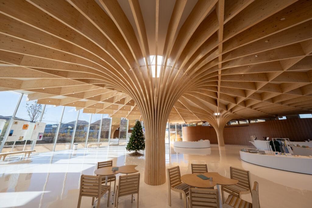 建物に入って目を引くのは柱。ヒノキの柱が木のように広がっていてとにかく美しい!
