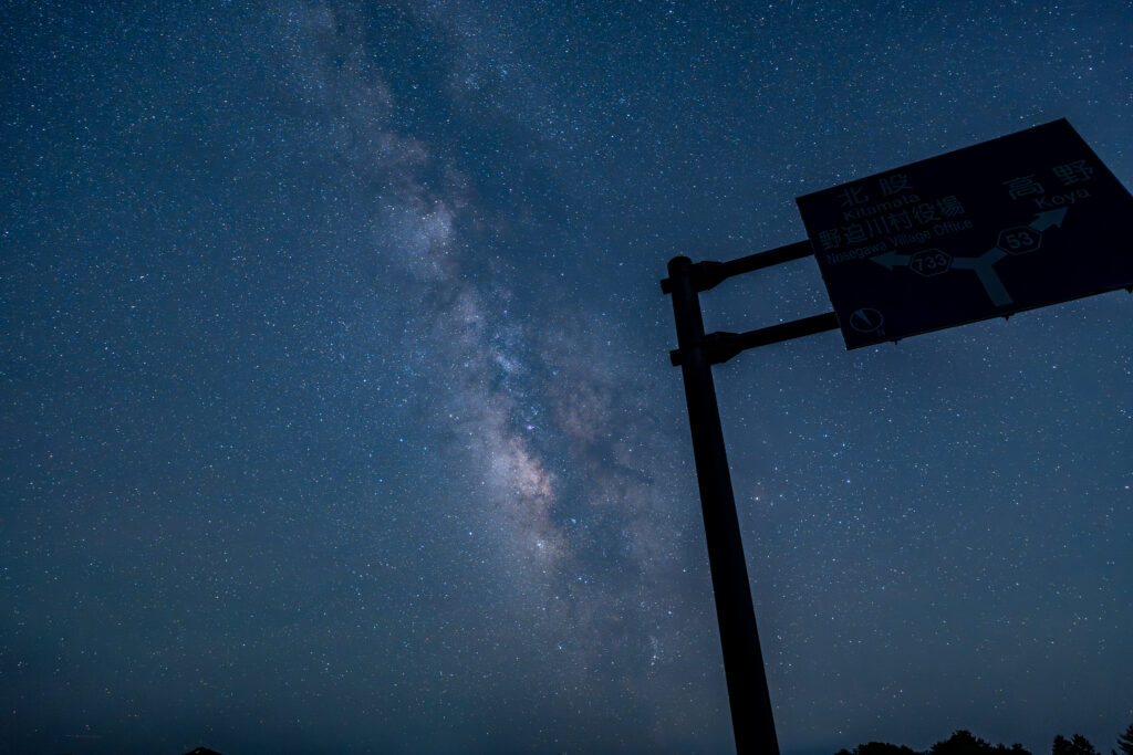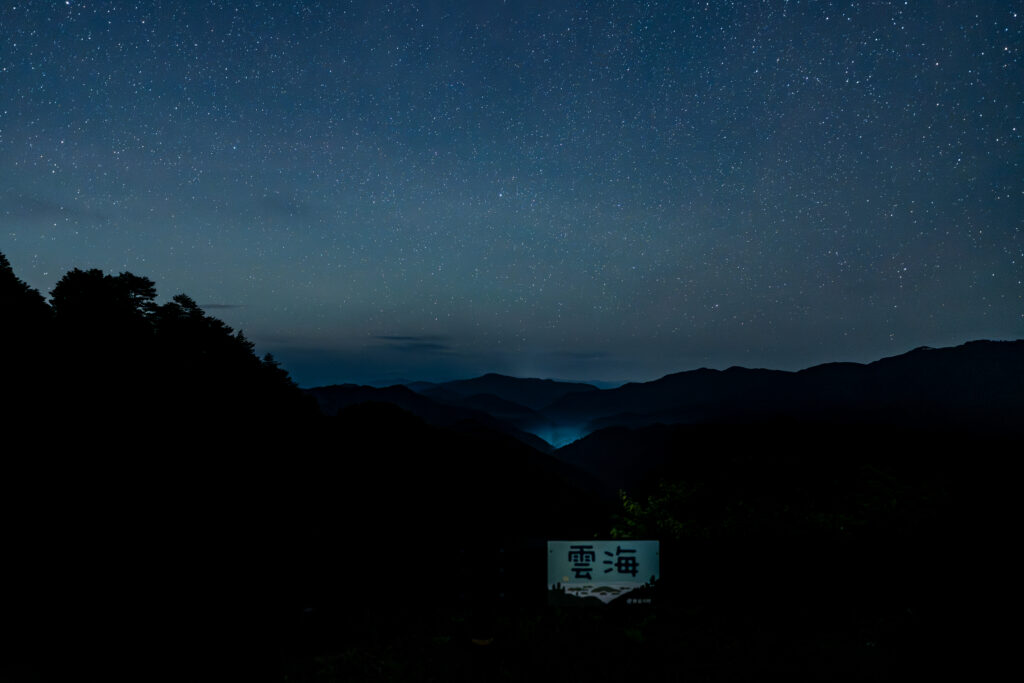 雲海の看板。明け方であれば雲海が見えたのでしょう。もしかしたら、山間の光は雲海なのかも・・・。星はいっぱいです。