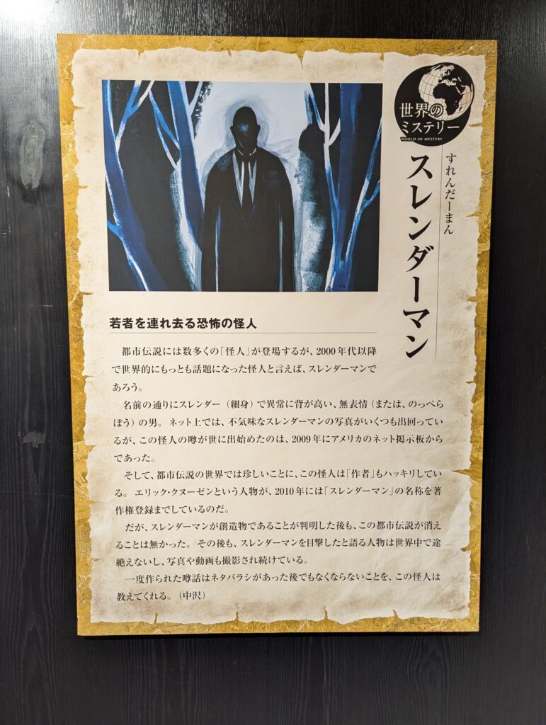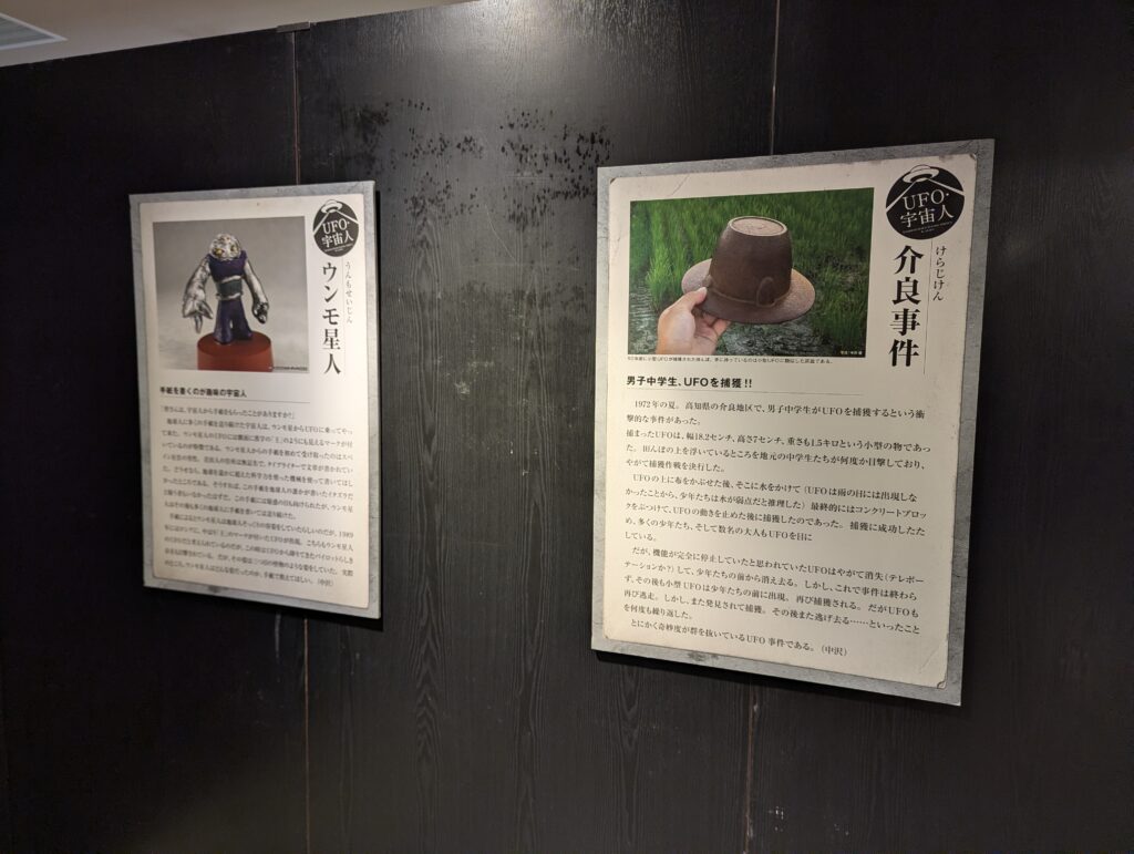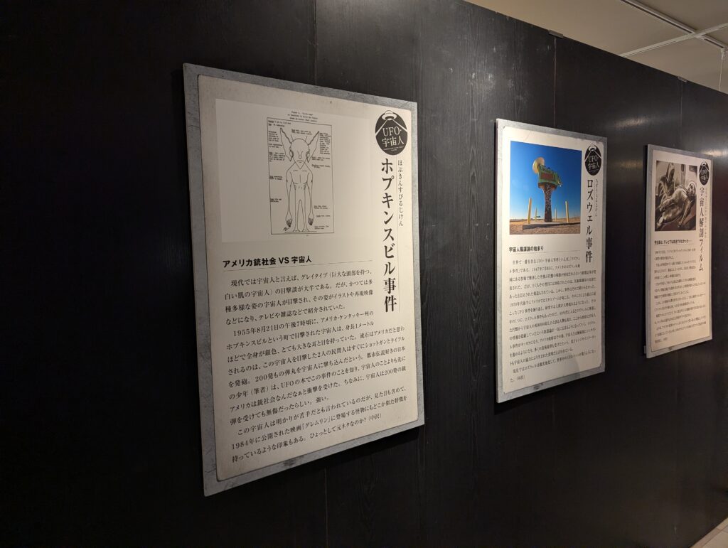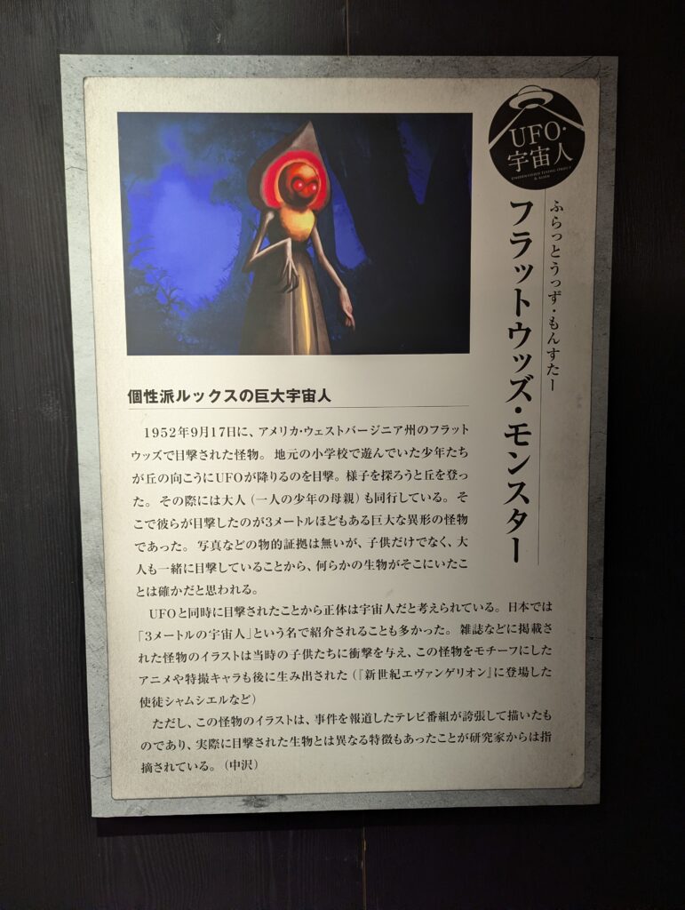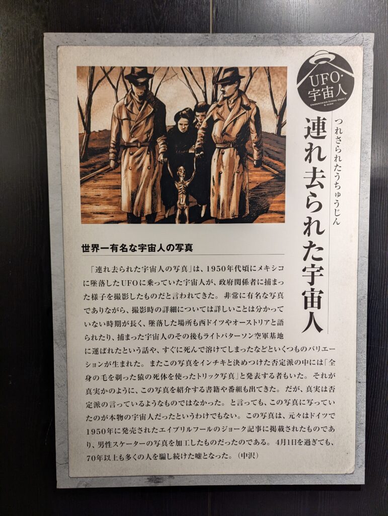 まずはUFO・宇宙人のパネルです。国内外の色々なUFOや宇宙人にまつわる都市伝説が紹介されています。小さい頃はUFOや宇宙人がとても怖くて見ることもできませんでしたが、今は興味の方が勝ってしまいますね。