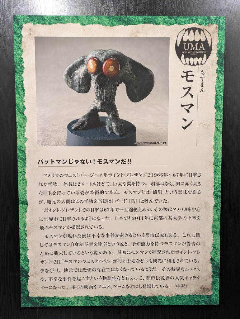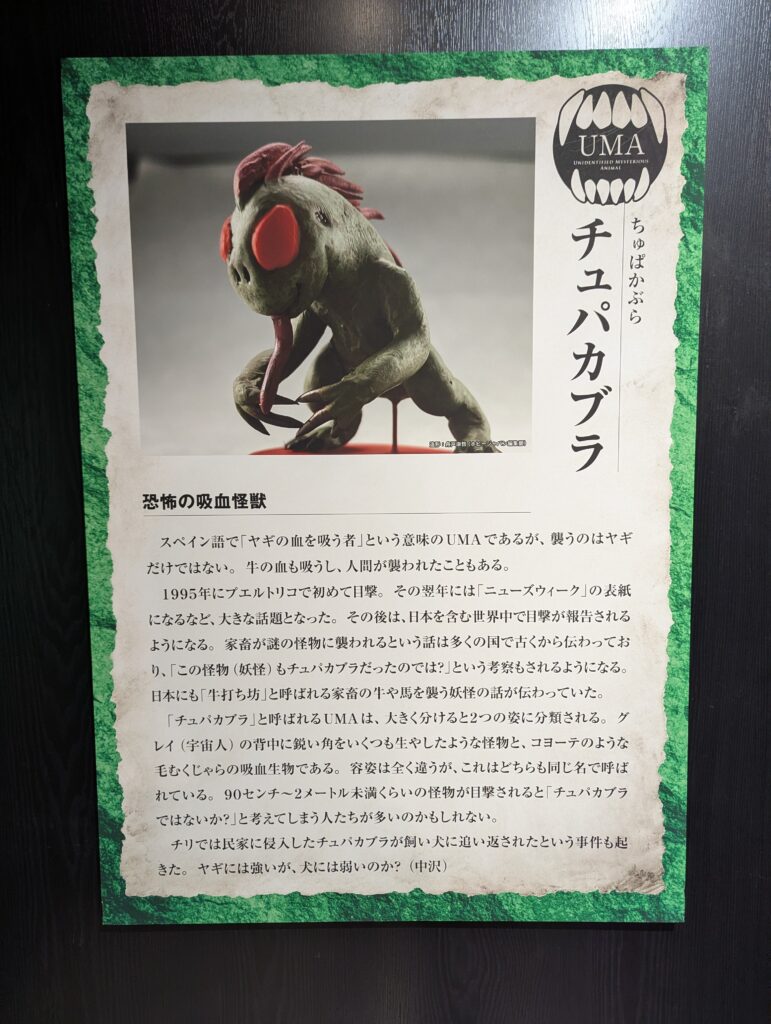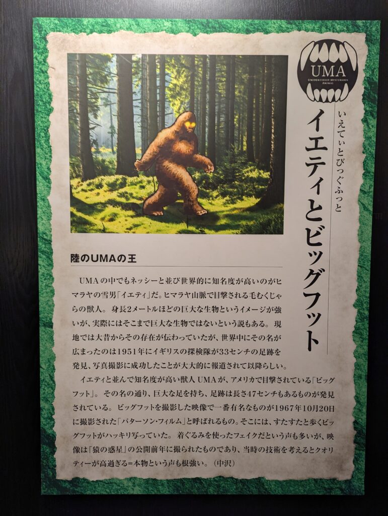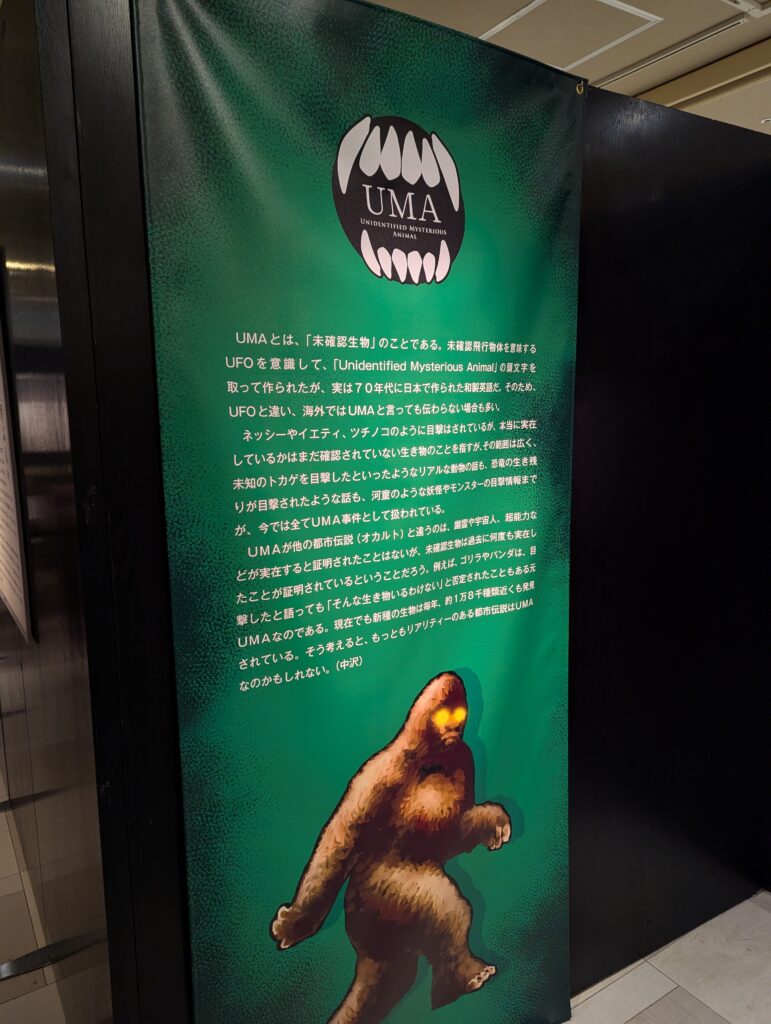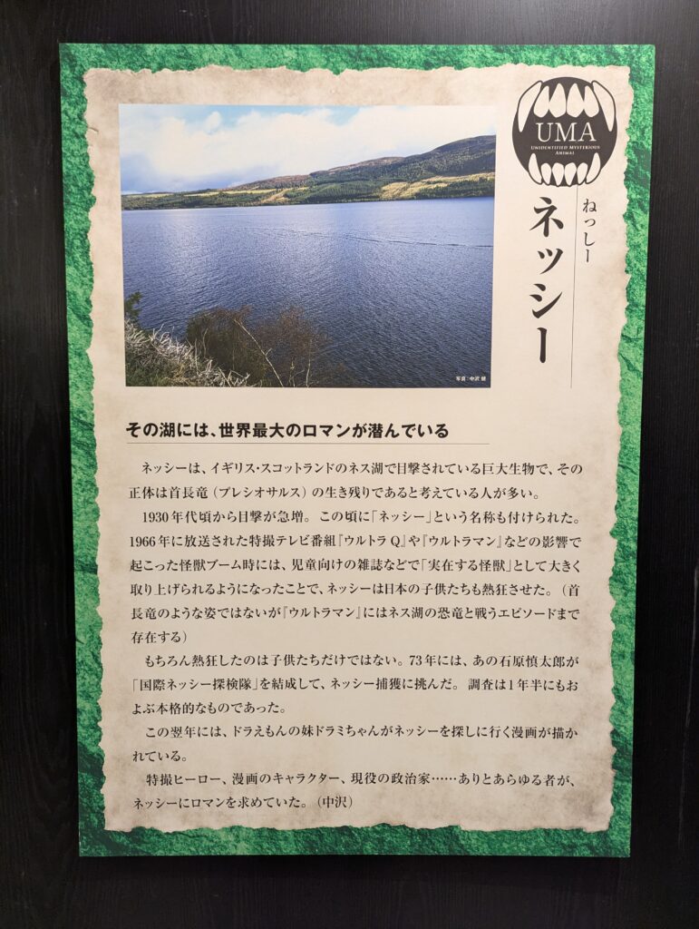 また、ネッシー、イエティ、チュパカブラ、モスマンなど色々なUMAのパネルも展示されています。