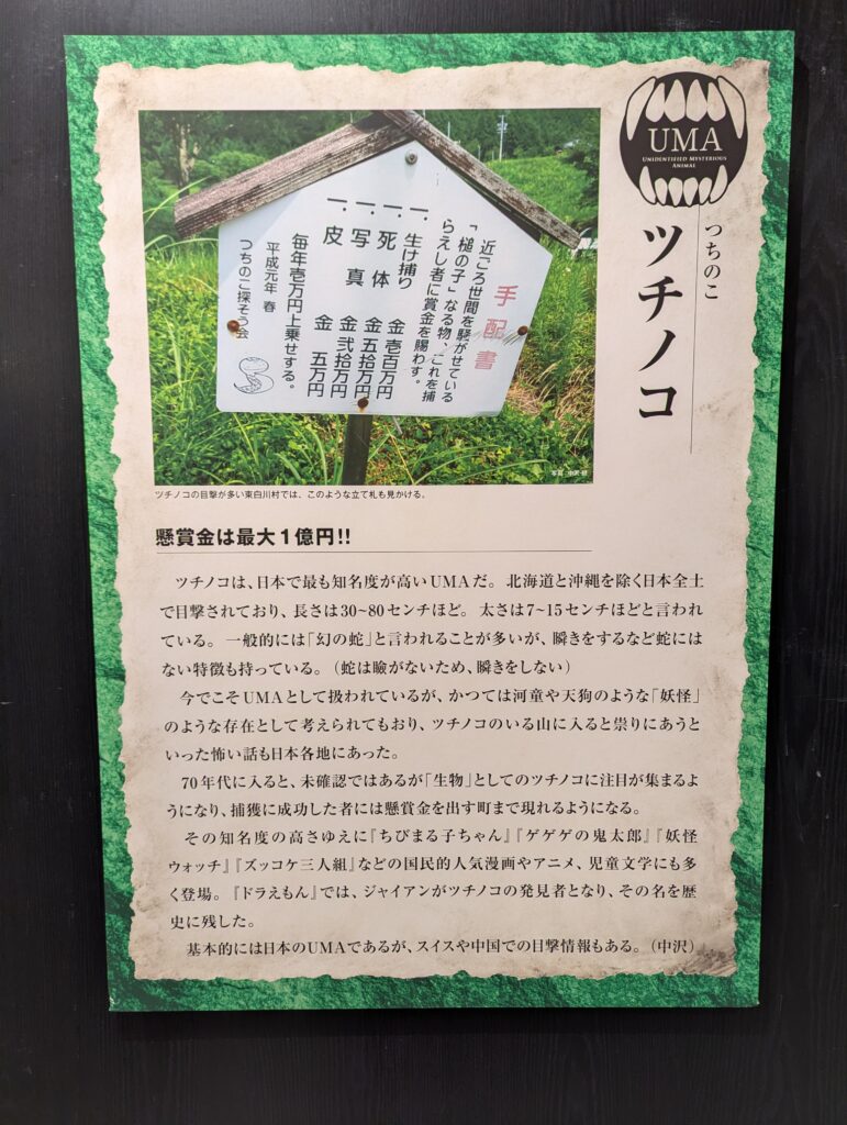 ツチノコ。パネルにも書かれている岐阜県の東白川村には「つちのこ館」があって、ツチノコの目撃情報も展示されています。特に面白かった目撃情報は、ツチノコは自分の尾っぽを咥えて輪のようになって坂を転がって移動するというものです。そんな移動方法、すごすぎませんか!?