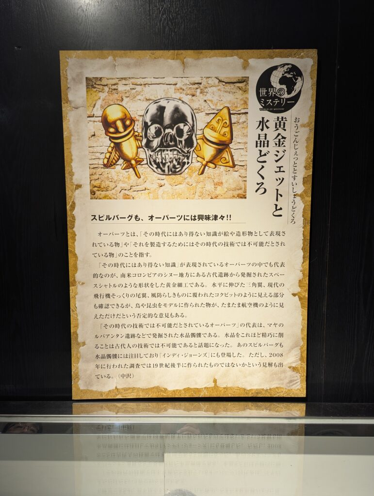 有名なオーパーツの水晶どくろと黄金ジェットですね。パネルにもある通り、オーパーツじゃないという噂もありますが…。ちなみにですが、山口県にあるムーバレーでもこれらのオーパーツが見つかっています。ムーバレーは色々なオーパーツが見られるだけでなく、遺跡のような造りで非常に楽しいところです。