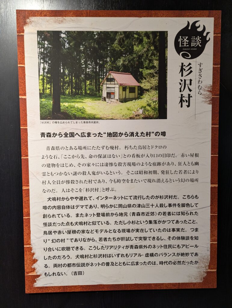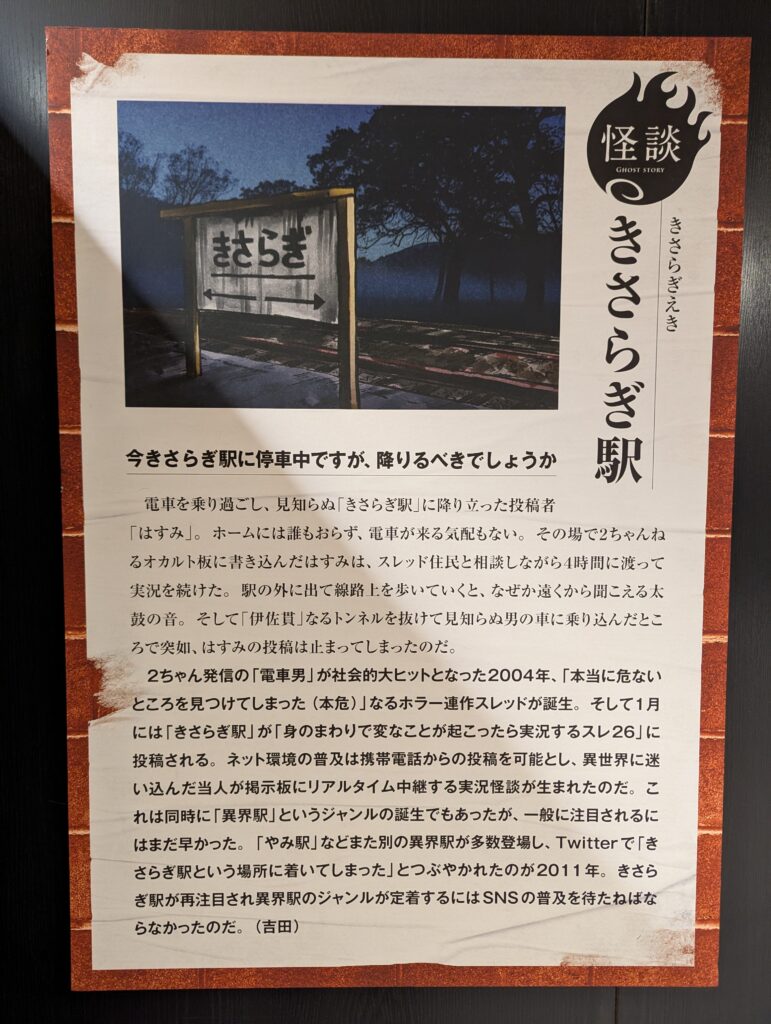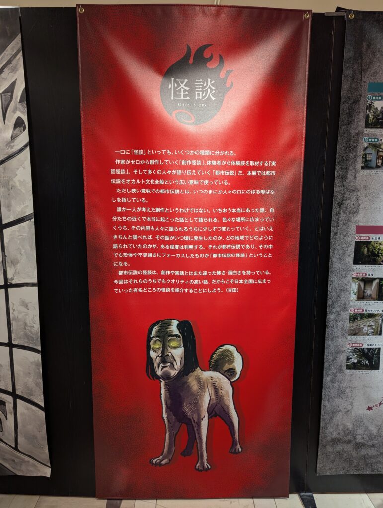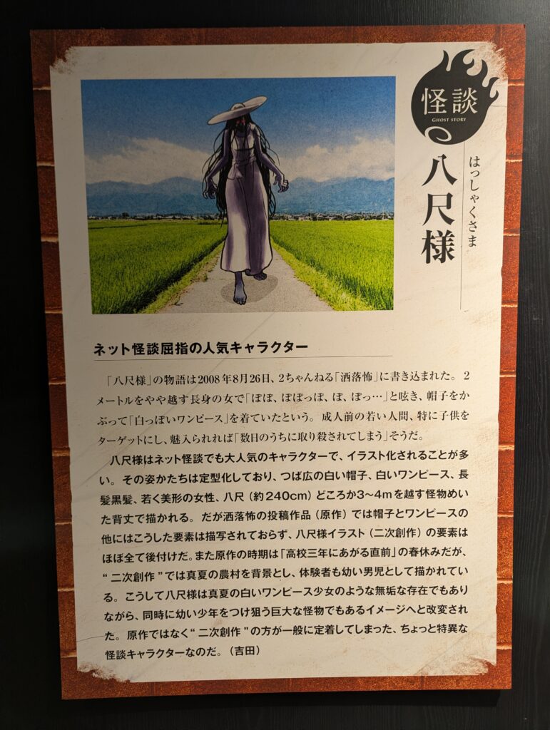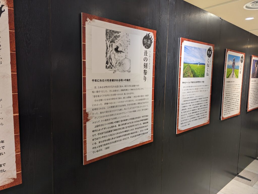 きさらぎ駅に杉沢村、心霊トンネルに八尺様といった怪談のパネルです。怪談は身近で、自分が遭遇するかもしれないというのが怖くて面白いところだと思います。