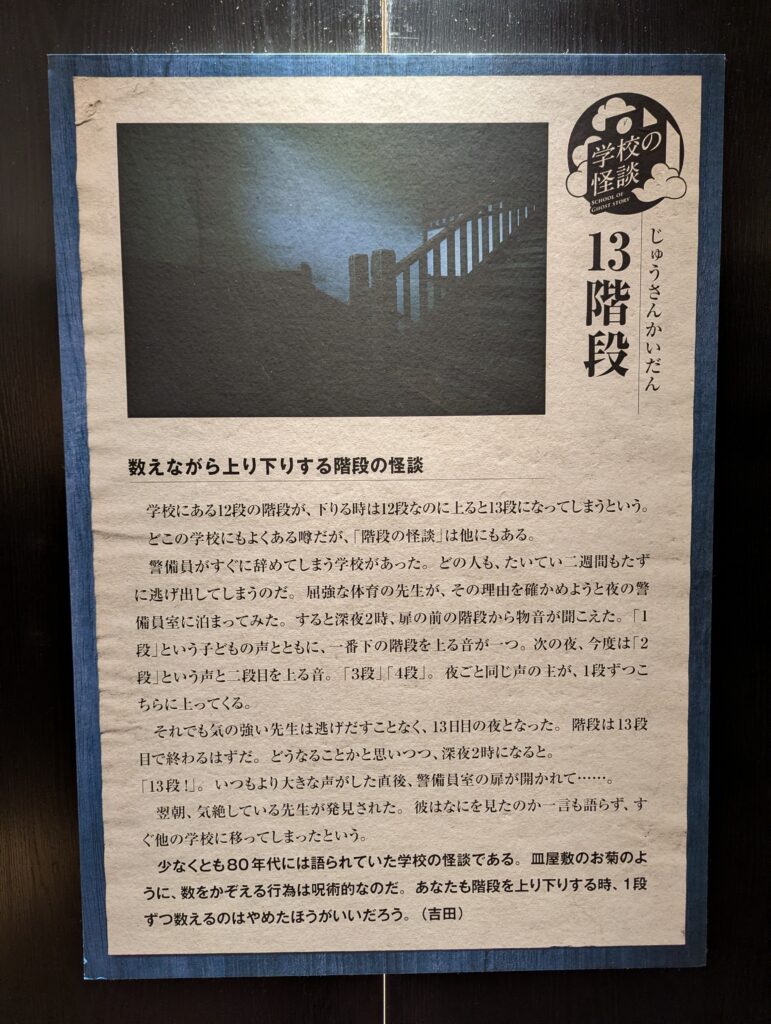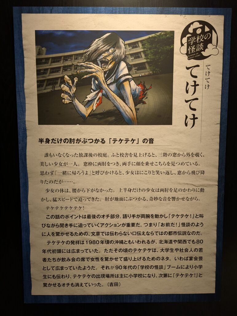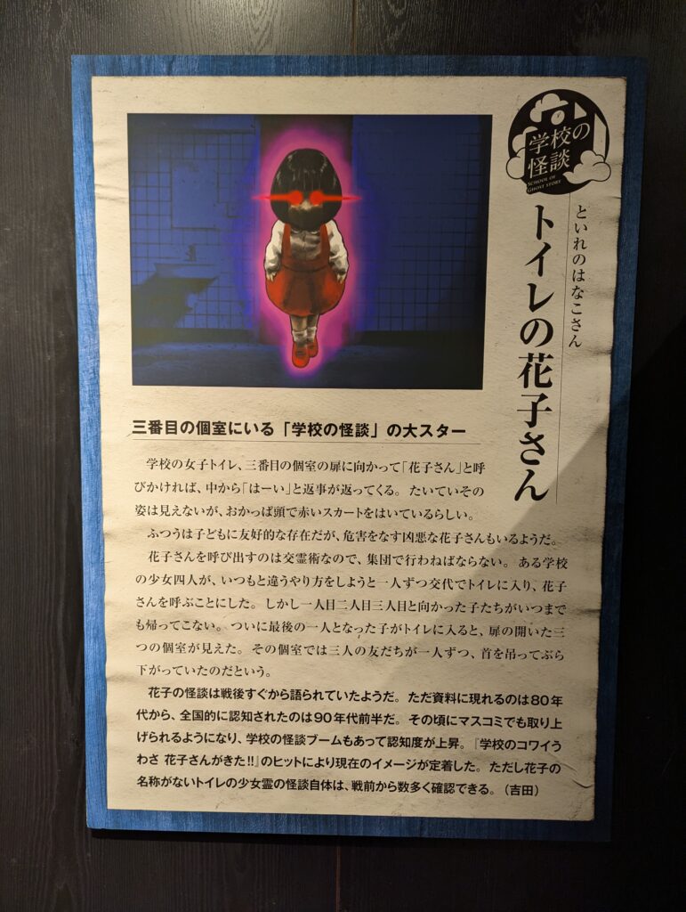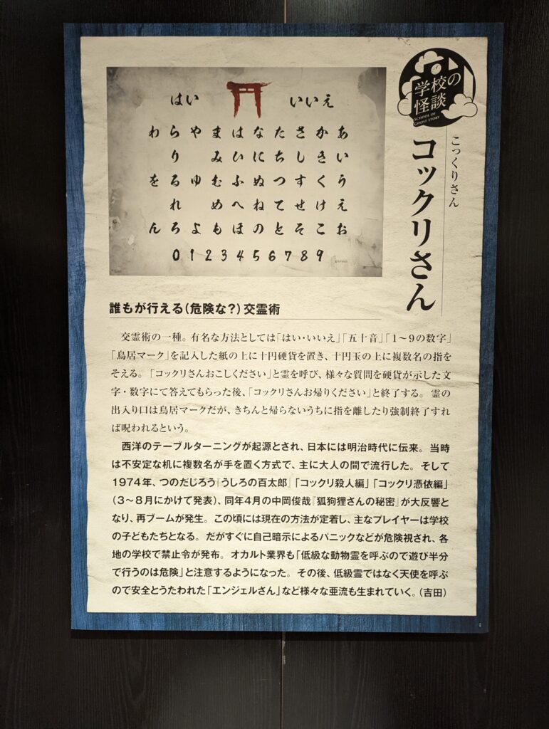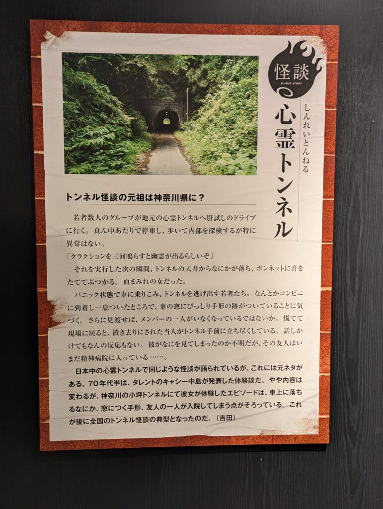 きさらぎ駅に杉沢村、心霊トンネルに八尺様といった怪談のパネルです。怪談は身近で、自分が遭遇するかもしれないというのが怖くて面白いところだと思います。