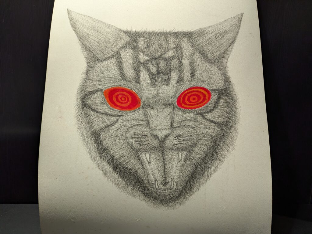 恨みを込めた猫の絵。人に恨みを抱いたときにしか作品を完成させない女性が書いた絵とのこと。なんだかパワーを感じる猫ちゃんだ。